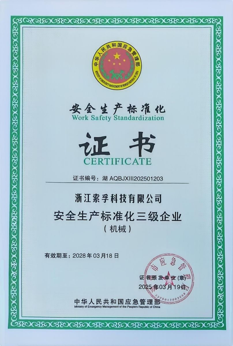 浙江索孚科技有限公司獲得“安全生產標准化企業“稱號